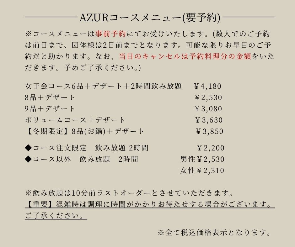 コースは3名様~ご予約承ります。各コースの表示価格は一人前の価格となります。